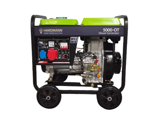 1) Diesel-Generator HARDMANN 5000-OT (5 kW, 3-Phasen) Der HARDMANN 5000-OT ist ein robuster 3-Phasen-Dieselstromerzeuger und das Herzstück dieses Notstromaggregats für das Haus. Mit einer Maximalleistung von 5.000 W, stabilem 50-Hz-Betrieb und automatischer AVR-Spannungsregelung liefert er auch bei wechselnder Last konstant sauberen Strom – ideal für Heizungssteuerung, Kühlschrank, WLAN-Router und Beleuchtung gleichzeitig. Angetrieben wird der Generator von einem luftgekühlten 4-Takt-Dieselmotor (Typ S188FBE, 456 ccm, bis 9,2 PS) mit komfortablem Elektrostarter – ein einfacher Knopfdruck genügt. Der integrierte 12,5-Liter-Dieseltank mit Tankanzeige ermöglicht einen effizienten Betrieb bei ca. 1,25 l/h (75 % Last). Die Anschlüsse umfassen 400 V CEE 16A, 230 V Schuko sowie 12 V DC (8,3 A) – für nahezu jedes Haushaltsgerät geeignet. Das stabile Stahlgerüst mit Fahrgestell und Rollen sorgt für einfache Mobilität. Ersatz- und Verschleißteile sind dauerhaft verfügbar.